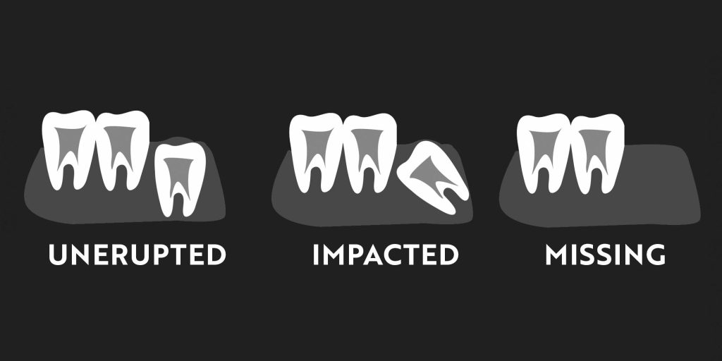 Dental x-rays are useful in finding teeth that do not appear inside the mouth when they should. When someone is “missing” a tooth at the time it should be present, it is important to determine whether that tooth is present and simply behind schedule, present but unable to erupt, or completely absent from the jaw.
